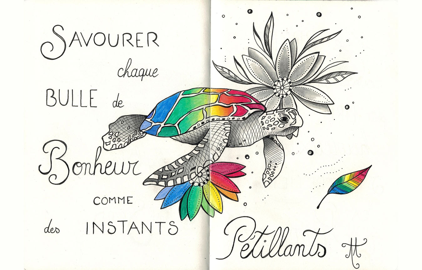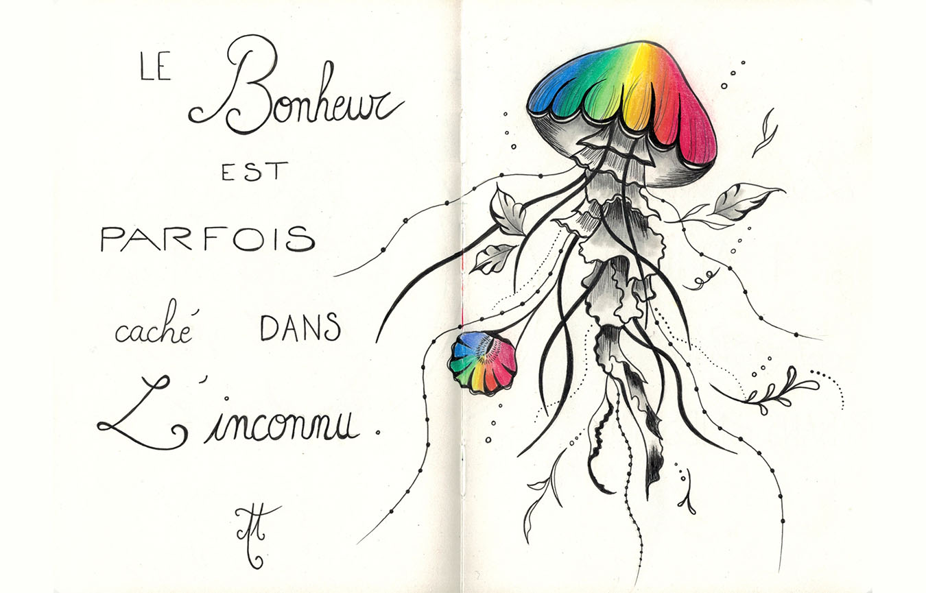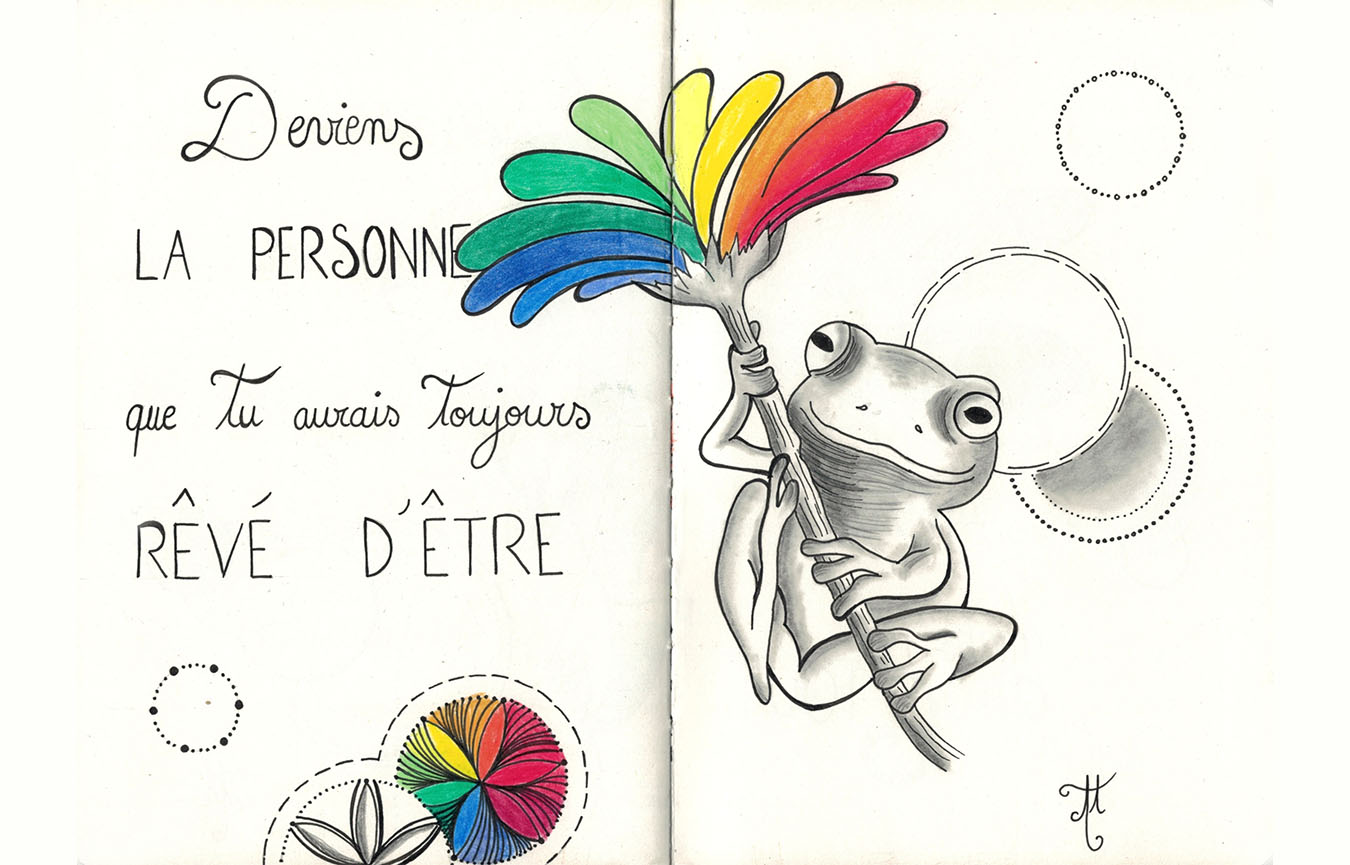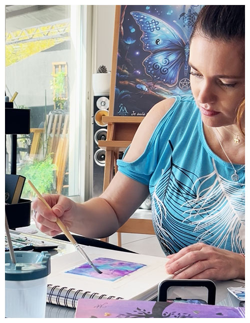 Je baigne dans le milieu artistique depuis ma tendre enfance car mes parents sont tous 2 Artistes Peintres. J'ai toujours adoré les couleurs, l'odeur du papier, les petits carnets et le dessin.